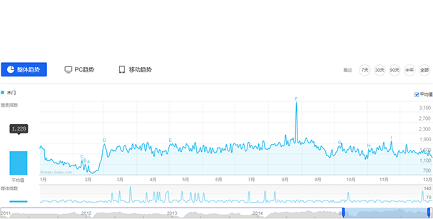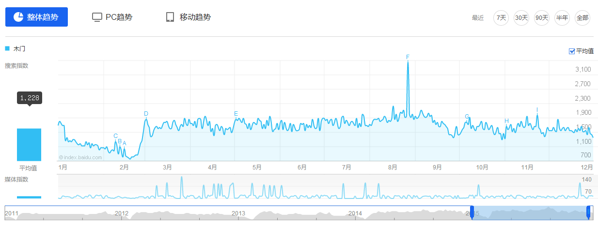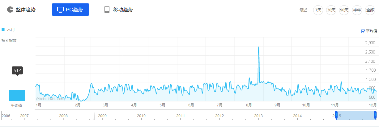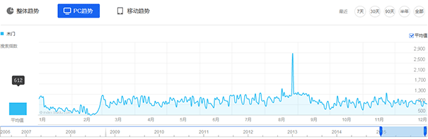 從木門行業(yè)PC端搜索指數(shù)上來看,其走勢與整體趨勢基本保持一致,全年平均搜索指數(shù)612,占整體搜索指數(shù)的49.7%,同比2014年下降10%。