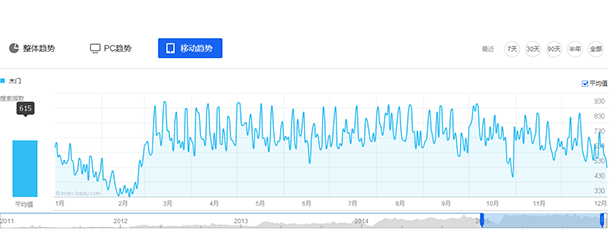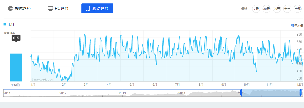 全年移動搜索指數(shù)平均值為615,略超PC端,且同比2014年增長12%,漲幅明顯。移動搜索已逐步超過PC端成為互聯(lián)網(wǎng)人群關(guān)注木門行業(yè)的主要渠道。
