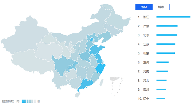 “江浙一帶”與北京、廣東、山東對木門的關(guān)注度最高。木門受不同區(qū)域濕度影響,品牌地區(qū)限制大,地域性差異較為明顯。互聯(lián)網(wǎng)人群分布也與產(chǎn)地直接掛鉤,東、北部地區(qū)分布最廣,逐漸向中部延伸。受產(chǎn)地與環(huán)境的影響,西部地區(qū)關(guān)注度較低。