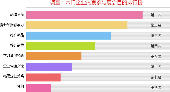 根據(jù)中華門窗網(wǎng)對(duì)木門企業(yè)的調(diào)查圖表顯示,多數(shù)木門品牌企業(yè)熱衷于參與行業(yè)展會(huì)的目的主要是品牌招商,其次是提升品牌影響力和推介新品。品牌招商顯然已經(jīng)成為現(xiàn)如今木門企業(yè)占領(lǐng)市場(chǎng)的主要“殺手锏”。