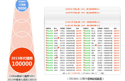 以地板行業(yè)最頂尖的招商網(wǎng)站中華地板網(wǎng)為例,據(jù)統(tǒng)計(jì)2008年,中華地板網(wǎng)經(jīng)銷商OA數(shù)據(jù)庫擁有精準(zhǔn)代理商只有5000人。而2013年,中華地板網(wǎng)經(jīng)銷商OA數(shù)據(jù)庫,擁有精準(zhǔn)代理商已超過100,000,總計(jì)有14784人通過互聯(lián)網(wǎng)報(bào)名尋求地板品牌代理,其中精準(zhǔn)代理商人數(shù)達(dá)7986名,占總報(bào)名人數(shù)54.02%。